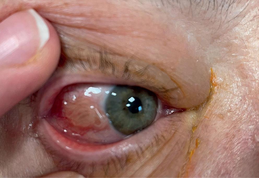 Later that year, a 65-year-old woman presented with pain in her right eye that had been present for 10 days and worsened at night. She had been treated by a general practitioner with tobramycin drops and ointment with no improvement. Clinical examination revealed oedema and hyperemia of the right upper eyelid (Fig. 1), and a subconjunctival parasite was visualised in the temporal quadrant of the conjunctiva of the right eye (Fig. 2). The parasite was surgically removed and identified as D. repens. Systemic therapy was also not required.