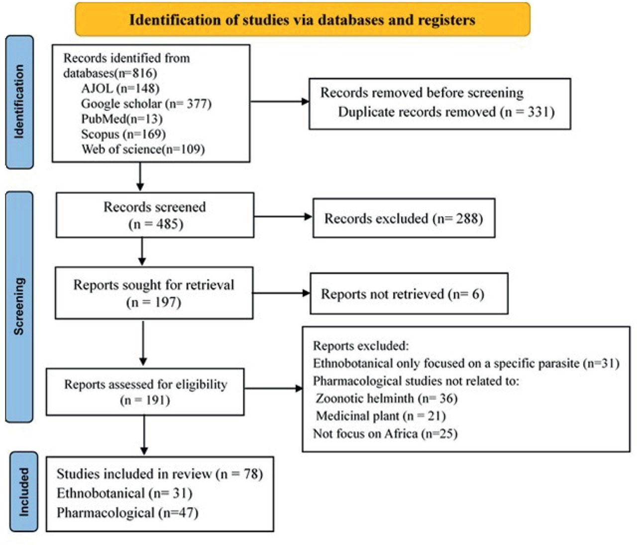 The selection process for eligible studies is illustrated in Figure 1. A comprehensive search was conducted across five electronic databases: AJOL (n = 148), Google Scholar (n = 377), PubMed (n = 13), Scopus (n = 169), and Web of Science (n = 109). After removing duplicate records, 485 studies remained for screening. Following title and abstract review, 288 of these were excluded. The full texts of 197 articles were assessed for eligibility, and 78 studies ultimately, met the inclusion criteria and were incorporated into the scoping review. Of these, 31 were ethnobotanical studies and 47 were pharmacological studies, spanning the publication period from January 2005 to May 2025 (Fig. 1).