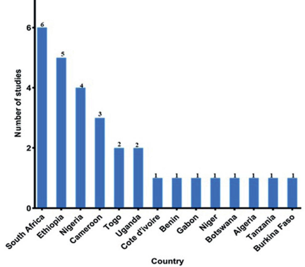 Distribution of research articles on the anthelmintic activity of indigenous African plants by country. The bar chart illustrates the number of studies conducted in each country, highlighting regional disparities in research output across the continent.