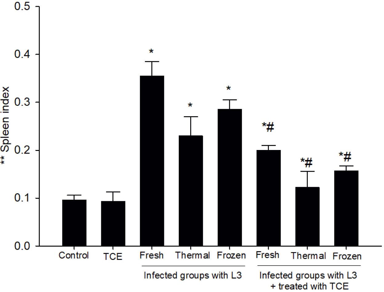 The spleen index, expressed as the ratio of spleen weight to body weight, was used as an indicator of splenic enlargement and pathological changes among the different experimental groups. A statistically significant elevation in spleen index values was observed in all infected groups when compared with the uninfected control group (Fig. 2). Mice infected with fresh L3 larvae showed the most severe splenomegaly, with a spleen index of 0.35 ± 0.03. Infections with thermally processed and frozen L3 larvae also increased spleen indices to 0.23 ± 0.04 and 0.26 ± 0.02, respectively, though slightly lower than in the fresh L3 group. Notably, TCE treatment significantly reduced infection-induced splenic enlargement in all groups. The spleen index decreased to 0.20 ± 0.01 in fresh L3-infected mice, and to 0.12 ± 0.03 and 0.16 ± 0.01 in the thermally processed and frozen L3 groups, respectively. These results underscore the protective effect of TCE in alleviating parasite-induced splenic hypertrophy and its potential to counteract infection-related pathological changes.