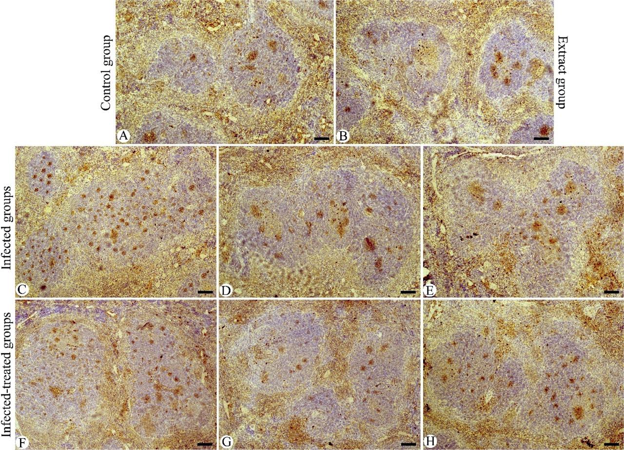 Immunohistochemical detection of caspase-3 in the spleen of mice. (A) control group. (B) Terfezia claveryi extract (TCE)-treated group. (C–E) infected groups with fresh, thermally, and frozen L3, respectively. (F–H) infected-treated groups with TCE (250 mg/kg) after inoculation with fresh, thermally, and frozen L3, respectively. Scale bar = 50 μm.