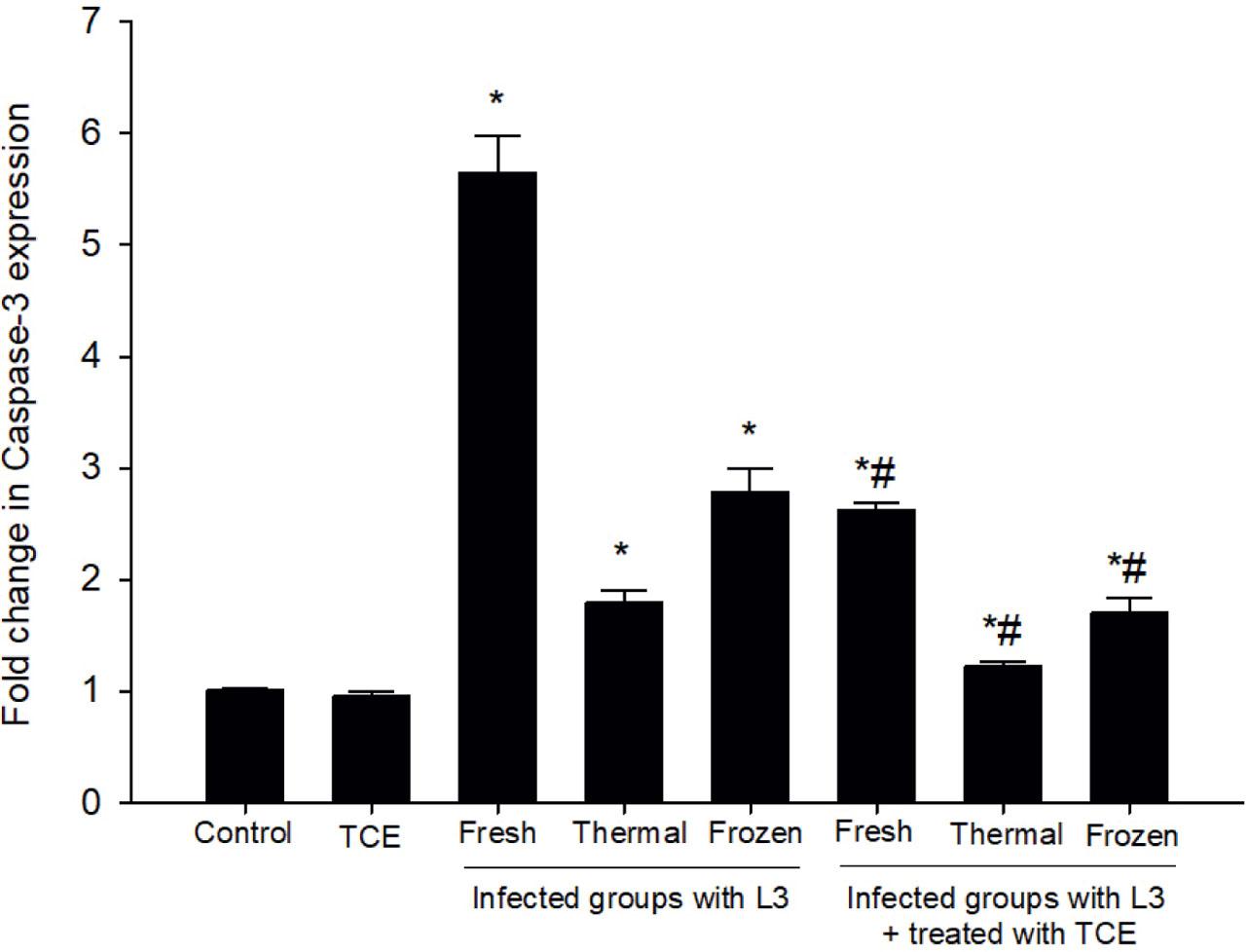 Infection with the L3 larvae resulted in a significant upregulation of Caspase-3 mRNA expression. Specifically, expression levels increased by approximately 5.65-fold when mice were exposed to fresh L3 larvae. In contrast, the increase was somewhat reduced to 1.79-fold for those infected with thermally processed L3 larvae, while a 2.78-fold increase was observed in mice infected with frozen L3 larvae. These findings were compared with a control group set at a baseline expression level of 1.00-fold, serving as a reference (Fig. 4). Following TCE treatment, a notable decrease in Caspase-3 mRNA expression was observed across all treatment groups. After TCE intervention, expression levels dropped to approximately 2.62-fold for the group infected with fresh L3, 1.21-fold for those with thermally processed L3, and 1.69-fold for mice infected with frozen L3 larvae. This marked reduction indicates that TCE played a significant role in modulating the inflammatory response initiated by the infection, leading to reduced Caspase-3 gene expression. These findings highlight the potential of TCE as a therapeutic agent for controlling inflammation linked to L3 larval infections (Fig. 4).