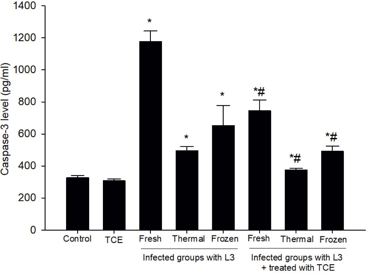This study investigated the effects of TCE on apoptosis during infection and its potential role in modulating inflammatory responses. Caspase-3, a key executor of apoptosis, was measured by Enzyme-Linked Immunosorbent Assay (ELISA), with results shown in Figure 5. L3 infection led to a significant increase in caspase-3 levels, reaching 1178.37 ± 64.94 pg/ml in mice infected with fresh L3 larvae. In contrast, infection with thermally processed L3 elicited a lower caspase-3 level of 495.35 ± 25.42 pg/ml, while those infected with frozen L3 demonstrated intermediate levels of 652.97 ± 124.71 pg/ml. These results were statistically significant compared with baseline control levels, demonstrating that L3 infection markedly elevates the apoptotic response. Intriguingly, when the mice were treated with TCE, a pronounced reduction in the L3-induced elevations of caspase-3 levels was observed. Specifically, caspase-3 levels were reduced to 744.79 ± 65.82 pg/ml in those subjected to fresh L3 after TCE treatment, whereas thermally processed L3 infections resulted in even lower levels of 375.06 ± 10.38 pg/ml. Additionally, mice infected with frozen L3 exhibited decreased caspase-3 levels, measured at 490.75 ± 33.54 pg/ml following TCE treatment. These results strongly indicate that TCE effectively mitigates L3-induced apoptosis, highlighting its potential as a therapeutic agent managing infections and related inflammatory responses.