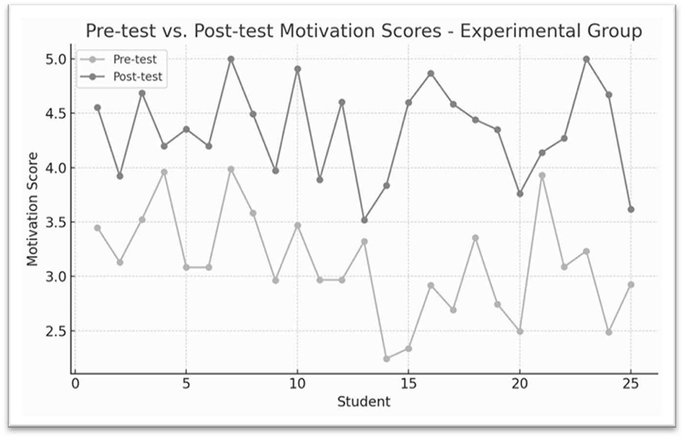 The motivation scores of the experimental group reveal a clear and consistent upward trend from the pre-test to the post-test phase. For nearly all 25 students, post-test scores demonstrate a marked increase compared to their initial measurements. Statistically, this suggests a strong effect of the gamified intervention. The clustering of post-test values near the upper limit of the Likert scale (score of 5) reflects not only increased motivation but also a possible homogenization of engagement levels among students. This phenomenon, known as positive convergence, highlights the ability of gamification to uplift motivation across varying initial performance levels (Figure 2).