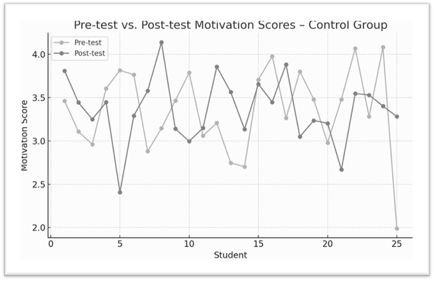 The control group’s motivation scores reveal a relatively flat trend, with no discernible pattern of consistent improvement or decline across the 25 students. The differences observed between pre-test and post-test scores are minimal and appear randomly distributed, suggesting that no substantial change in motivation occurred over the course of the intervention. This visual finding aligns with the results of the paired samples t-test, which yielded t(24) ≈ 0.94 and a p-value of 0.36. Such a result clearly indicates that the observed differences are not statistically significant and could be attributed to random variation (Figure 3).