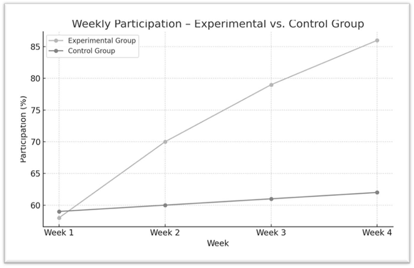Comparing weekly participation between the experimental and control groups provides a striking visualization of engagement trends throughout the 4-week intervention. The experimental group exhibited a steady and substantial rise in participation rates, beginning at 58% and culminating at 86% by the final week. This progressive increase suggests a growing sense of involvement, likely fueled by the intrinsic appeal and external structure of the gamified learning environment (Figure 4).