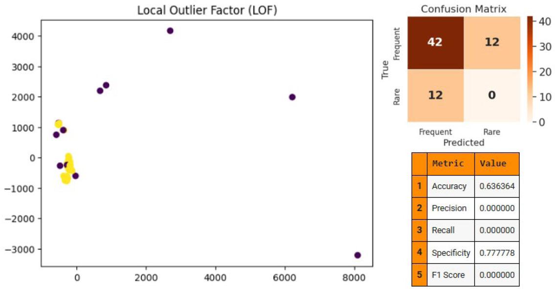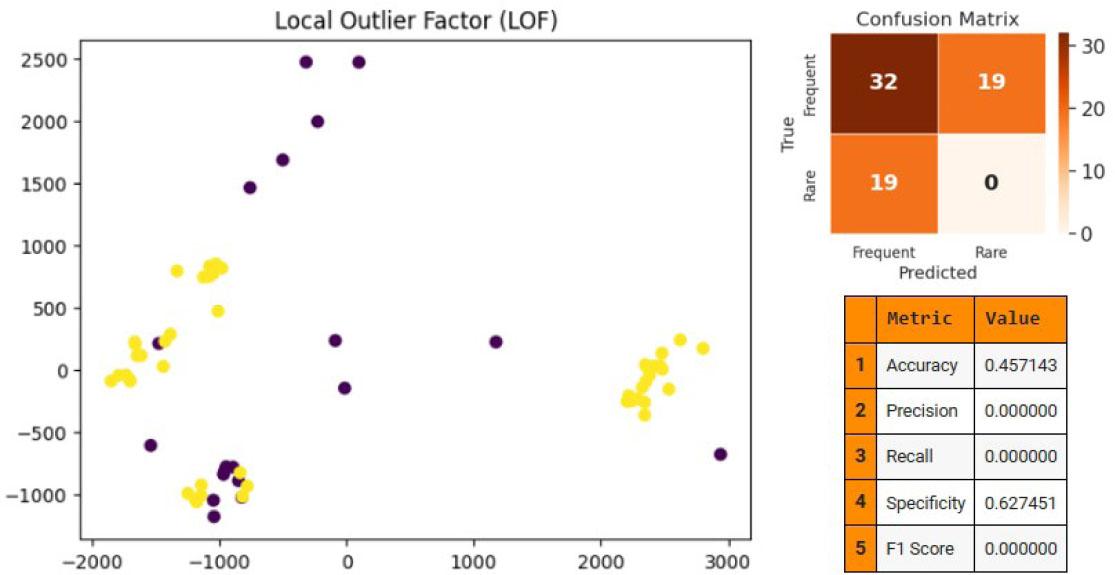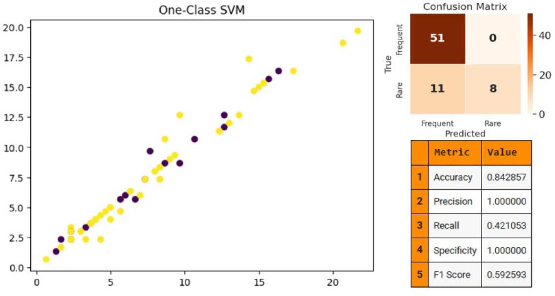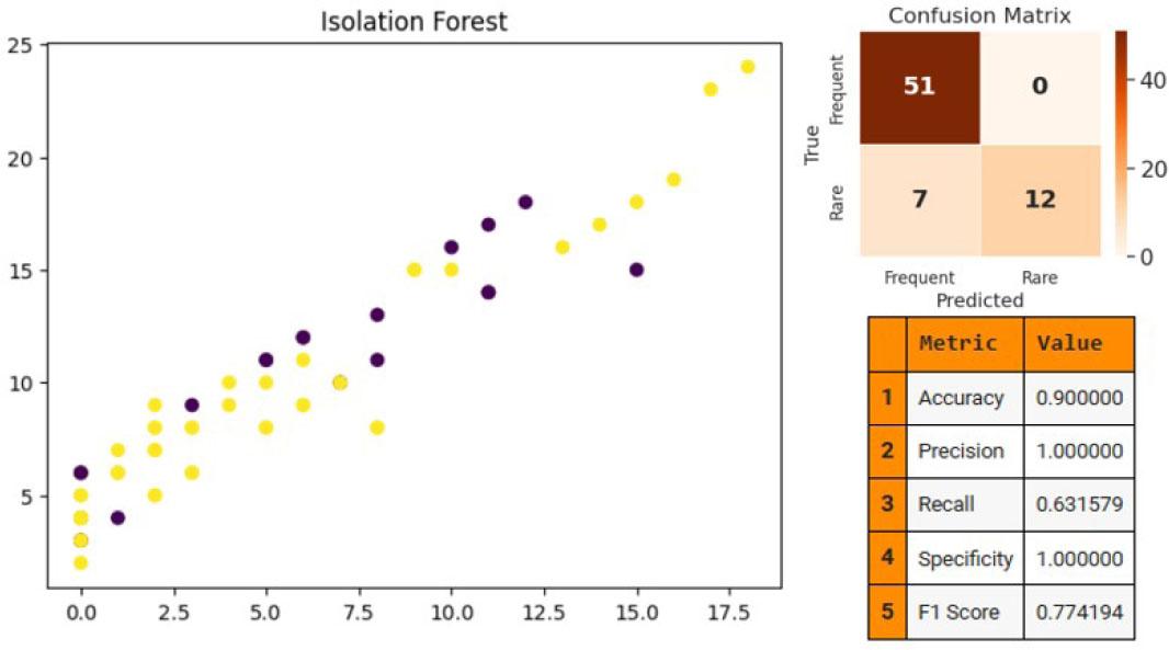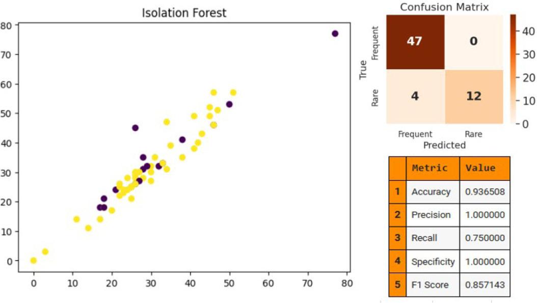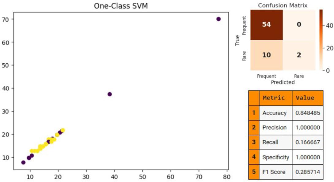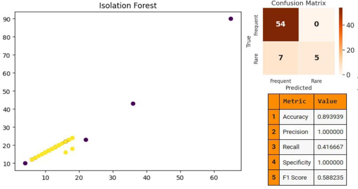 The initial phase assessed five distinct techniques: One-Class SVM (SVM), Isolation Forest (IF), Autoencoders (AE), Local Outlier Factor (LOF), and Cluster-Based Method (CBM). The examination involved scrutinizing their accuracy in detecting rare patterns, laying the groundwork for understanding the comparative performance of these methods. Following a meticulous evaluation, it was discerned that the cluster-based approach exhibited superior performance compared to the other methods, as depicted in Figure 49. Notably, the performance hierarchy observed in the ongoing analysis reveals Isolation Forest’s superior performance compared to One-Class SVM.