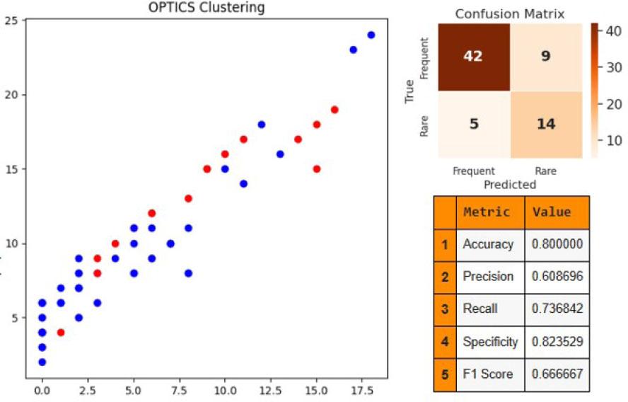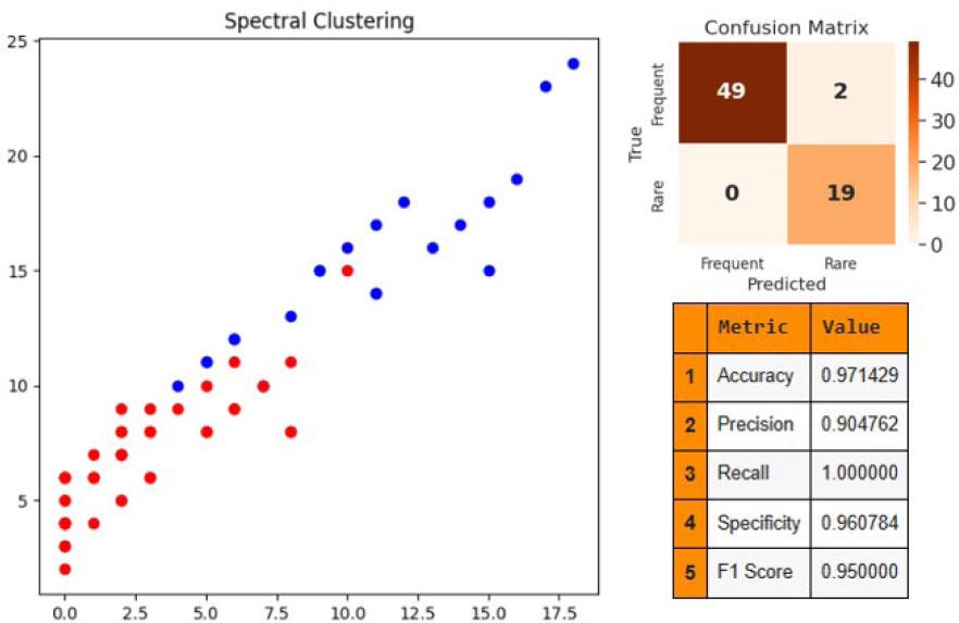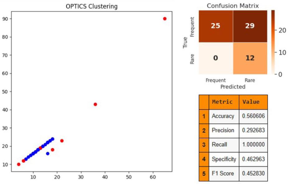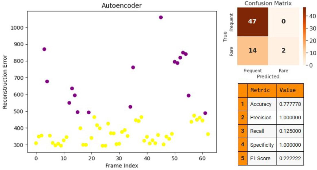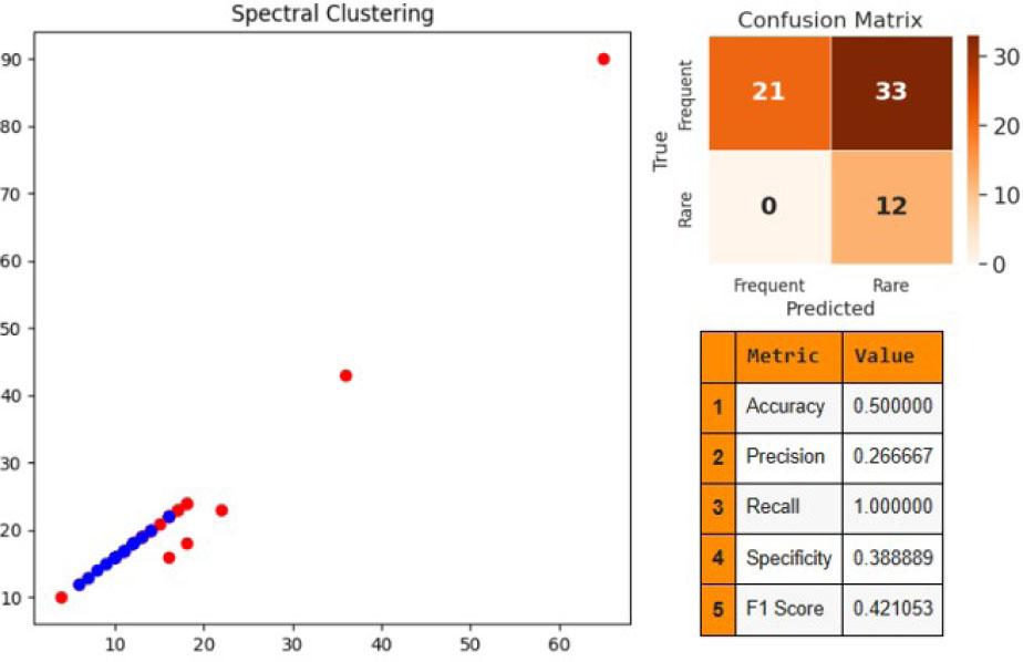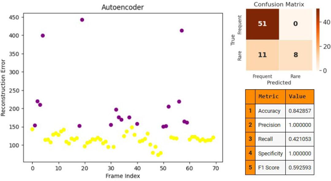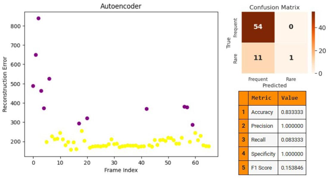 Cluster-based Analysis: Figures 13, 14, and 15 exemplify the continuous utilization of Cluster-based Analysis on datasets 1, 2, and 3, respectively. The scatter plots in these figures offer a visual depiction of the organization of rare and frequent frames. Within these visual representations, the dominance of yellow hues indicates the occurrence of frames at higher frequencies, while the distinct purple tones characterize frames identified as rare. The rationale behind the second phase of the investigation exploration is rooted in the understanding that different clustering techniques possess unique characteristics. Identifying the optimal method among Agglomerative, Divisive, Spectral Clustering, DBSCAN, OPTICS, and K-means clustering techniques is crucial for enhancing the efficacy of rare pattern mining in home premises CCTV footage. This phase aims to comprehensively assess each clustering technique in handling the complexities of CCTV data, including effectively detecting rare patterns. By evaluating these techniques, the research aims to determine which approach or combination of approaches offers the highest accuracy, sensitivity, and specificity in identifying anomalies or rare events within the CCTV footage.