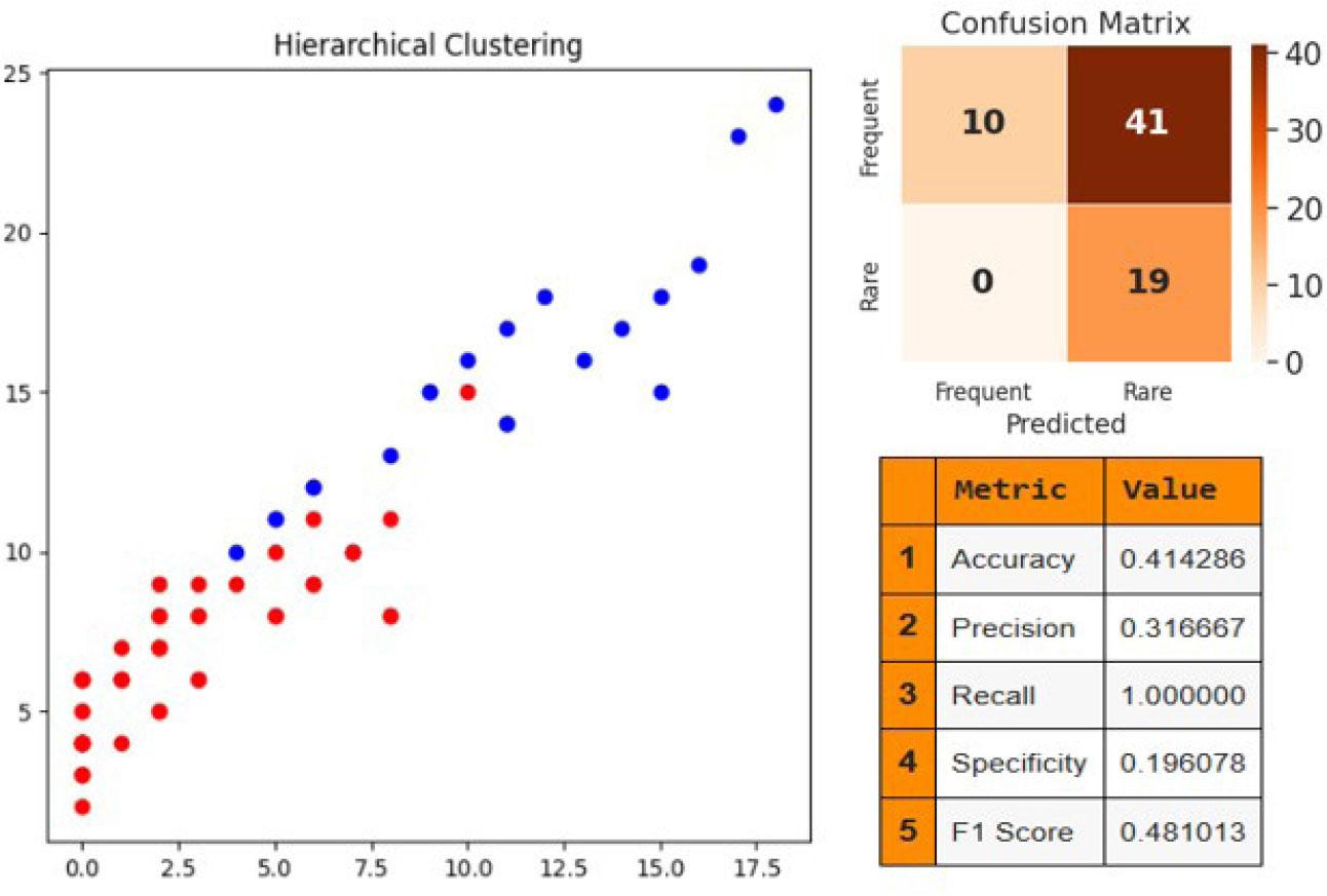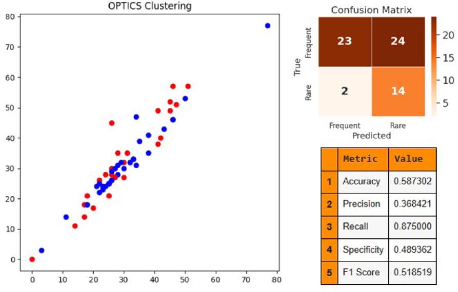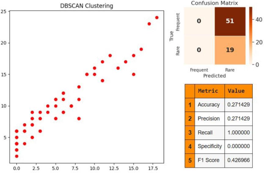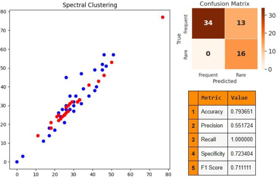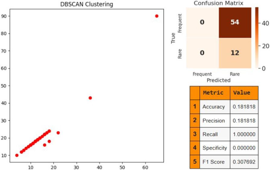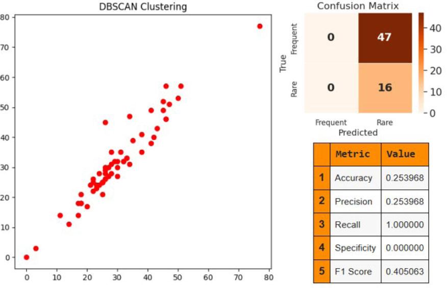 Cluster-based Analysis: Figures 13, 14, and 15 exemplify the continuous utilization of Cluster-based Analysis on datasets 1, 2, and 3, respectively. The scatter plots in these figures offer a visual depiction of the organization of rare and frequent frames. Within these visual representations, the dominance of yellow hues indicates the occurrence of frames at higher frequencies, while the distinct purple tones characterize frames identified as rare. The rationale behind the second phase of the investigation exploration is rooted in the understanding that different clustering techniques possess unique characteristics. Identifying the optimal method among Agglomerative, Divisive, Spectral Clustering, DBSCAN, OPTICS, and K-means clustering techniques is crucial for enhancing the efficacy of rare pattern mining in home premises CCTV footage. This phase aims to comprehensively assess each clustering technique in handling the complexities of CCTV data, including effectively detecting rare patterns. By evaluating these techniques, the research aims to determine which approach or combination of approaches offers the highest accuracy, sensitivity, and specificity in identifying anomalies or rare events within the CCTV footage.