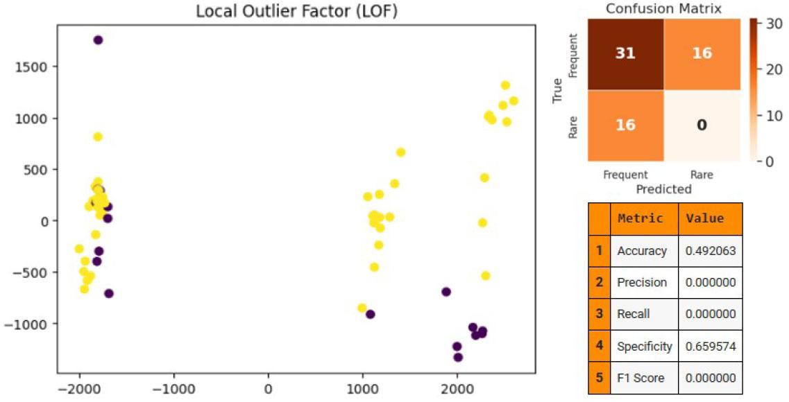 Autoencoder-based Analysis: Figures 7, 8, and 9 showcase the persistent application of Autoencoder-based Analysis on datasets 1, 2, and 3, respectively. The scatter plots presented in these figures represent the arrangement of rare and common frames. In these visualizations, the prevalence of yellow hues signifies the presence of frames occurring more frequently, whereas the discernible purple tones depict frames recognized as rare. Local Outlier Factor: Figures 10, 11, and 12 illustrate the ongoing application of Local Outlier Factor (LOF) Analysis on datasets 1, 2, and 3, respectively. The scatter plots depicted in these figures visually represent the arrangement of rare and common frames. In these graphical presentations, the prevalence of yellow hues signifies the occurrence of frames at higher frequencies, while the distinct purple tones characterize frames identified as rare by the LOF algorithm.