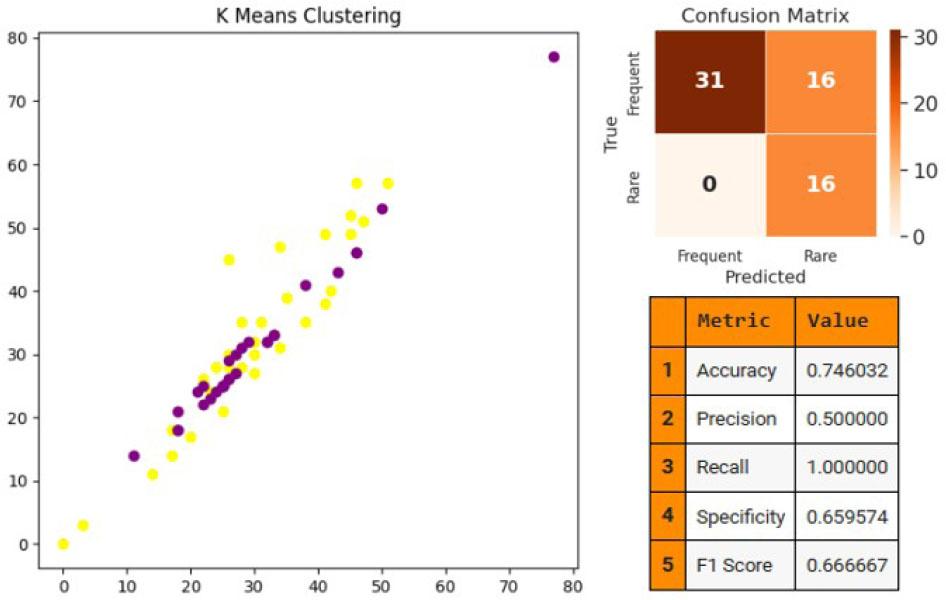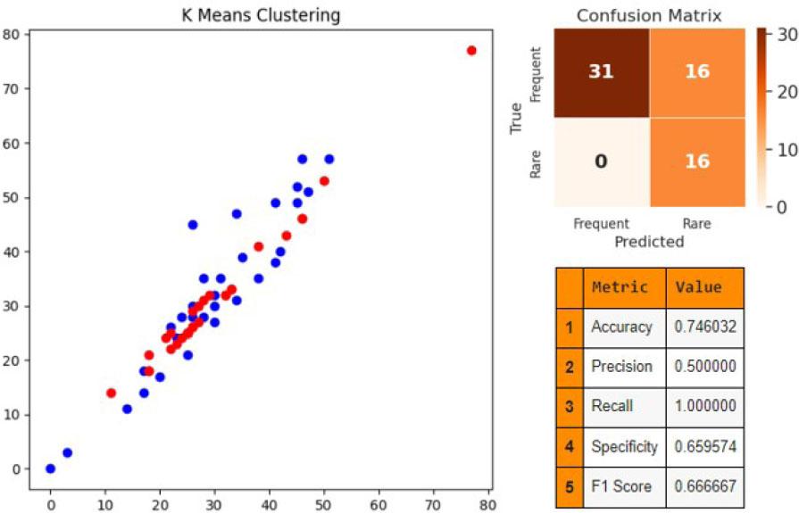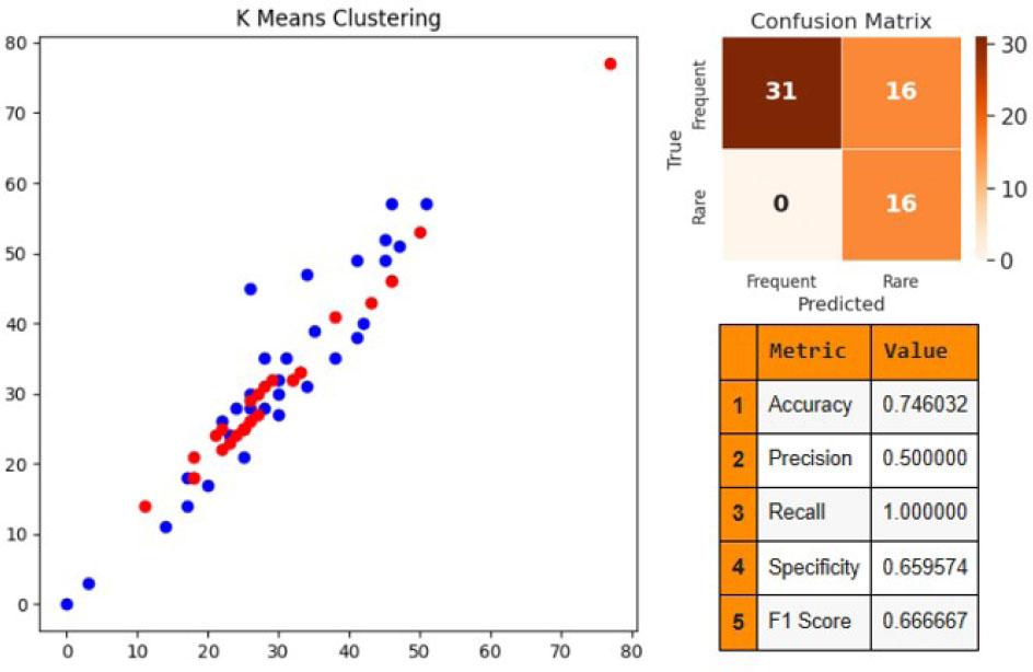 K means clustering with a predetermined number of clusters: as showcased in Figures 43, 44, and 45, it demonstrates a deliberate choice to define the cluster count before analysis. This method bypasses conventional techniques like the elbow method or silhouette analysis to ascertain the optimal number of clusters. Instead, it relies on pre-existing knowledge or domain expertise to specify the appropriate clusters for the dataset under examination. By leveraging this approach, analysts can leverage their understanding of the dataset’s underlying structure to guide the clustering process [11]. This can be particularly advantageous when there’s confidence in the relevant features and their relationships within the data, enabling the determination of an optimal cluster count with precision [14]. The scatter plots presented visually depict the distribution of frames with varying frequencies within the dataset. The prevalence of blue tones and pronounced red hues in these plots reflects a strategic effort to achieve a balanced clustering outcome. By carefully considering the specified cluster count and the inherent characteristics of the data, the clustering process aims to strike a harmonious balance between the identified clusters, effectively capturing the nuances and patterns present within the dataset.