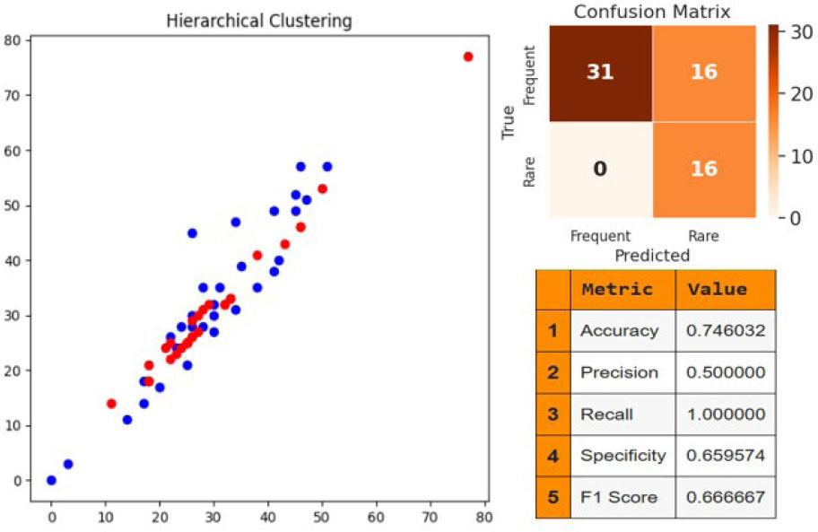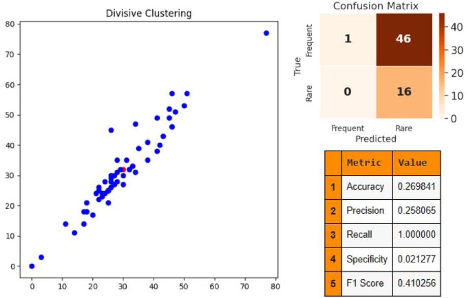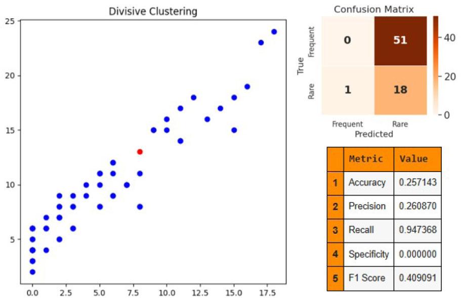 Divisive Clustering: Figures 19, 20, and 21 show the persistence of Divisive Clustering on datasets 1, 2, and 3, correspondingly. The scatter diagrams within these visuals provide a graphical representation of the arrangement of rare and frequent frames. In these depictions, the prevalence of shades in the blue signifies the presence of frames occurring more frequently, whereas the discernible red hues distinctly mark frames recognized as uncommon.