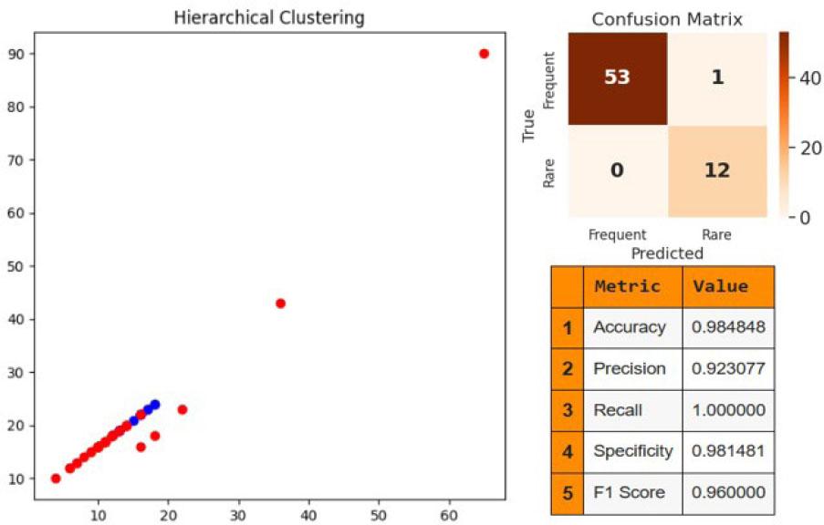 Agglomerative Clustering: Figures 16, 17, and 18 exemplify the continuous utilization of Agglomerative Clustering on datasets 1, 2, and 3, respectively. The scatter plots in these figures offer a visual depiction of the organization of rare and frequent frames. Within these visual representations, the dominance of blue hues indicates the occurrence of frames at higher frequencies, while the distinct red tones characterize frames identified as rare.