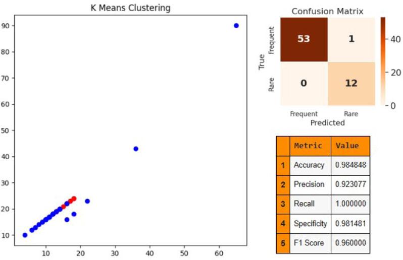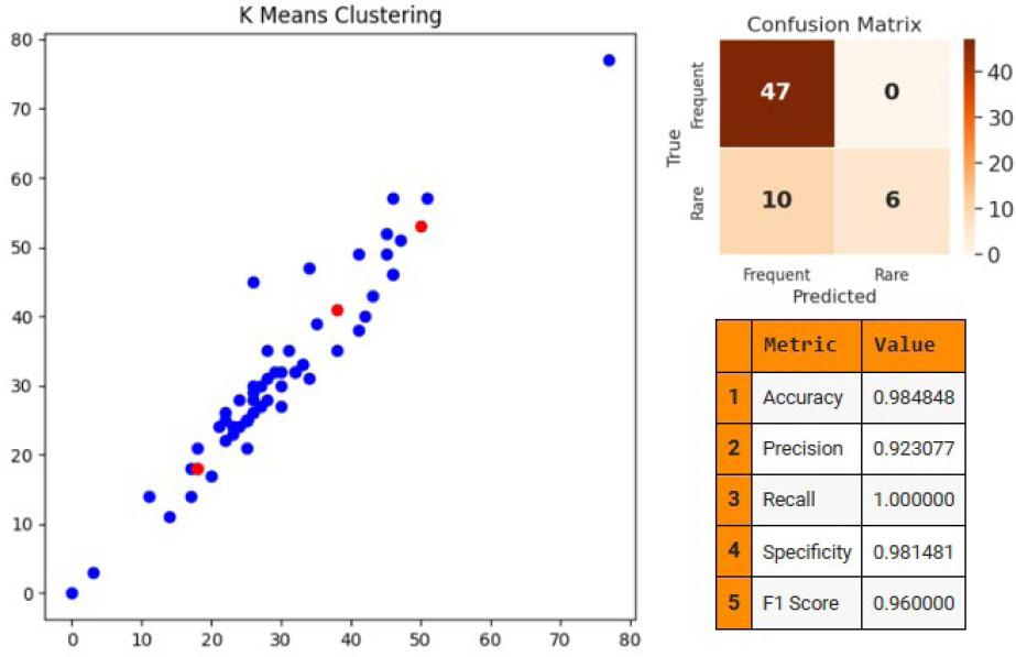 Silhouette Method: Figures 37, 38, and 39 illustrate the persistence of K-Means Clustering on datasets 1, 2, and 3, prompting the application of the Silhouette Method to assess the appropriateness of cluster assignments. The silhouette method can provide a quantitative validation of the graphical representation of rare and frequent frames. The blue shades denoting higher-frequency frames and discernible red hues marking uncommon frames in the scatter diagrams align with the Silhouette Method’s objective to ensure well-defined and distinct clusters.