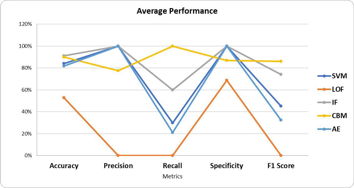 Average Performance of Isolation Forest, One-Class SVM, Cluster-Based Method, Local Outlier Factor, and Autoencoders.