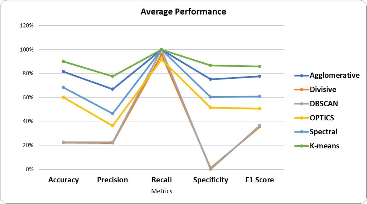 Average Performance of OPTICS, DBSCAN, Divisive Clustering, Spectral Clustering, K-means Clustering, and Agglomerative Clustering.