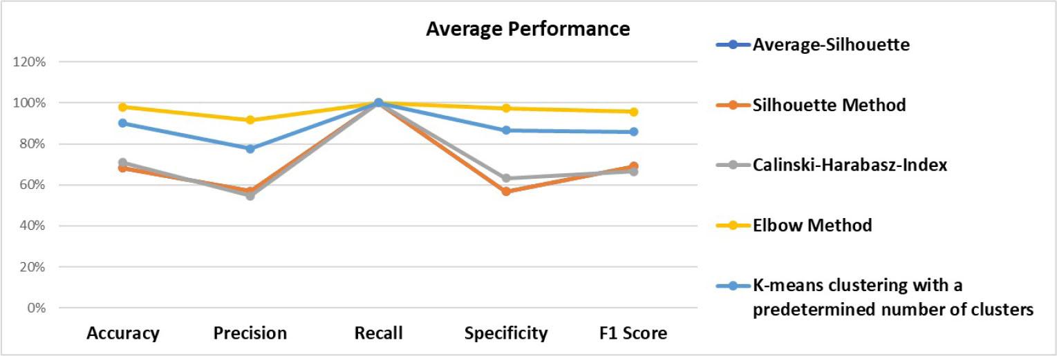 Average Performance of the Average Silhouette, Silhouette Method, Calinski-Harabasz Index, K means clustering with a predetermined number of clusters and Elbow Method.