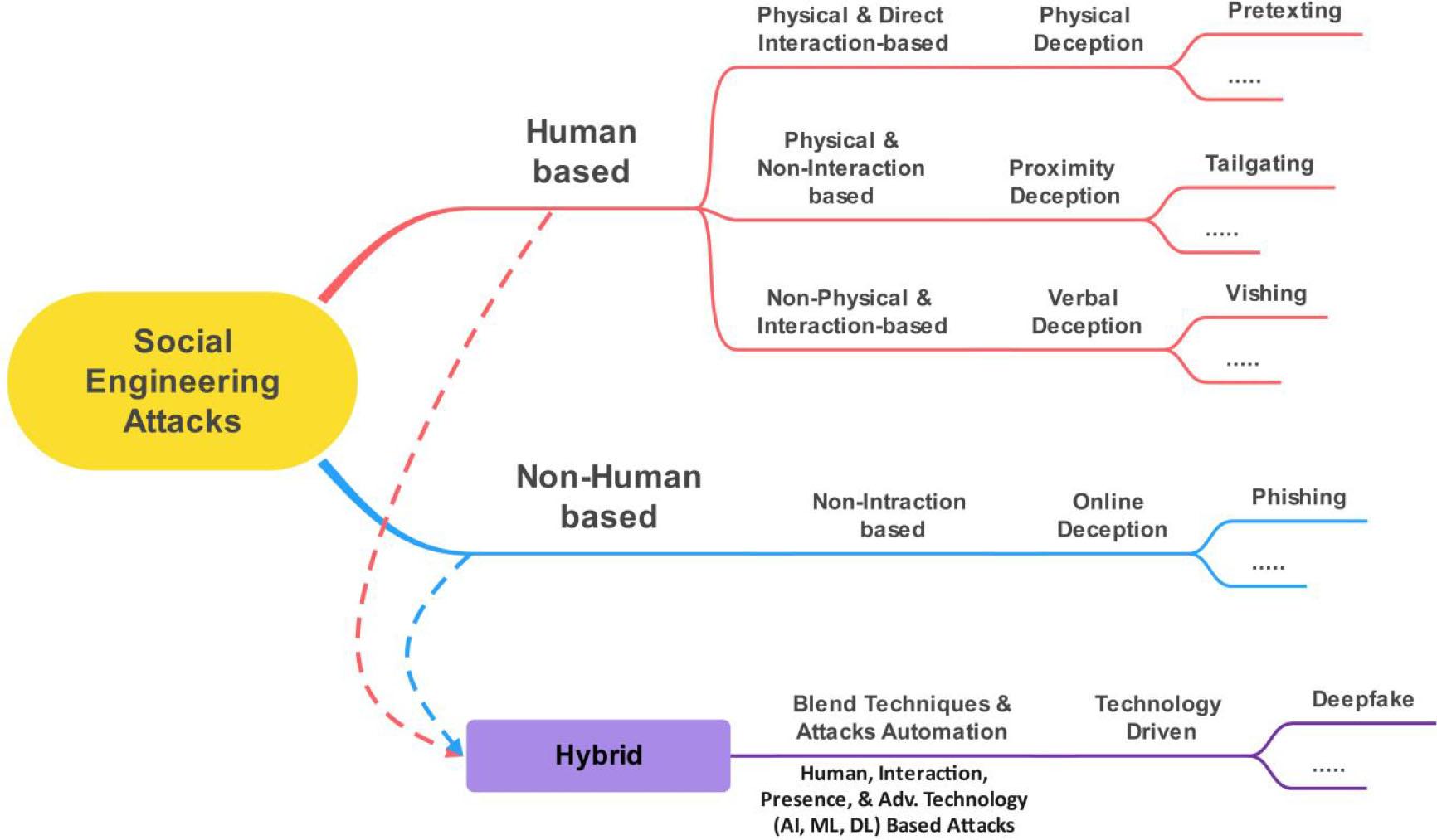 The term “social engineering” originally belonged to political science [19, 20] and was later used for various purposes to empower people, strengthen and structure society and in policy making before it stepped into the cybersecurity realm or for malicious purposes. Since the age of phone phreaking (1970) [21, 22], social engineering has continuously gained popularity, proving its stealth nature and scalability over time [23]. Today, social engineering is one of the most overlooked yet highly effective cybersecurity threats, demonstrating its persistent and evolving role in digital security [24]. The modern definition of social engineering blurs the line between social engineering and non-social engineering attacks. [25] states it as an art that uses human psychology, [26] defined as the practice of exploiting human characteristic(s). Whereas [13, 27] stated this as a relationship of asymmetric knowledge between the attacker and targets. [28] defined as the most creative approaches to gain access to the information system. Researchers [14, 29, 30] described a multilayered attack, which leverages social, psychological, technical, and physical aspects to bypass security. [31] refers to the art of human hacking, and [25] stated it is completely different from traditional cyberattack techniques and procedures. The authors [32] define it as the simplest method of gathering information about a target. Whereas [19] refers to technology-driven tactics, and [27, 33, 34] refer to diverting human behaviour and decision-making. Various definitions may be perceived differently with different perspectives and understanding of the social engineering definition. The definitional viability and ambiguity due to its multi-disciplinary nature and varied perspective cause misclassification, which makes it difficult to identify attacks and categorise them appropriately. For example, some new types of attacks/hypothetical attacks are presented with a lack of evidence and support, such as “Flame Wars Attack” and “Astronfing Attacks” [33].
