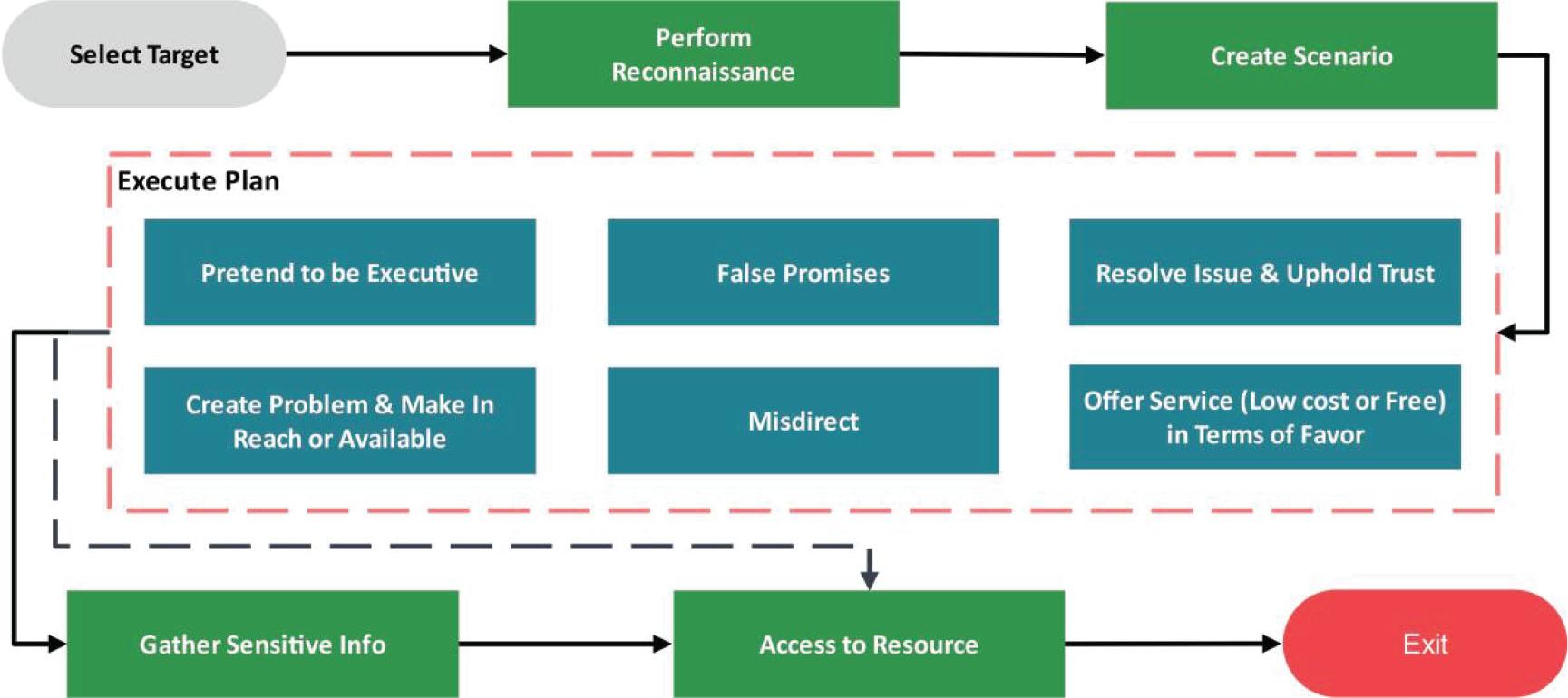 Create Scenario: based on the previous stages, the attacker carefully builds a proven and credible story. An attacker usually designs two strategies: entry and exit. Entry strategy, to establish his credibility, which tends to believe in the situation and act accordingly to assist him. Exit strategy, to safely leave the premises without being suspected.