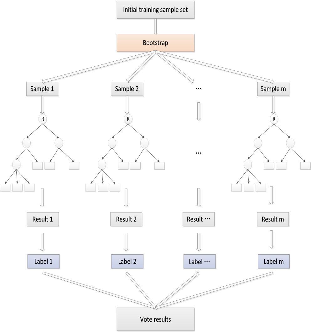 1) Assume that there are currently N samples and select N samples by random extraction with put back. Random extraction with put back means that a sample is randomly selected from the data set every time. After the selection, the sample is put back into the data set and then returned to select new samples. The selected samples are used to train a decision tree;