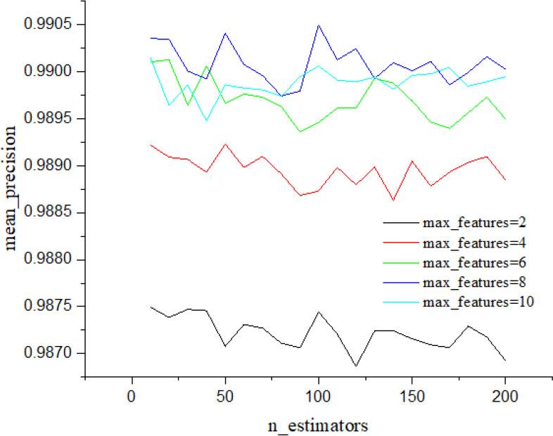 It can be intuitively observed from the figure that when the maximum feature number is selected differently, the corresponding average accuracy rate is also different. The average accuracy rate of the model here can be basically maintained above 0.99. To sum up, when the maximum feature number is 8, the number of decision trees in the forest is 100, and the splitting index is “Gini”, the model achieves the best effect on the verification set.