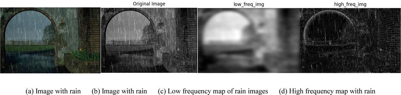 It can be seen from the comparison results that the rain image is decomposed into high-frequency regions and low-frequency regions according to the frequency, and most of the rain marks exist in the high-frequency region. The low frequency map is integrated into the generator as an additional constraint for better results. The frequency decomposition module is shown in Figure 2.