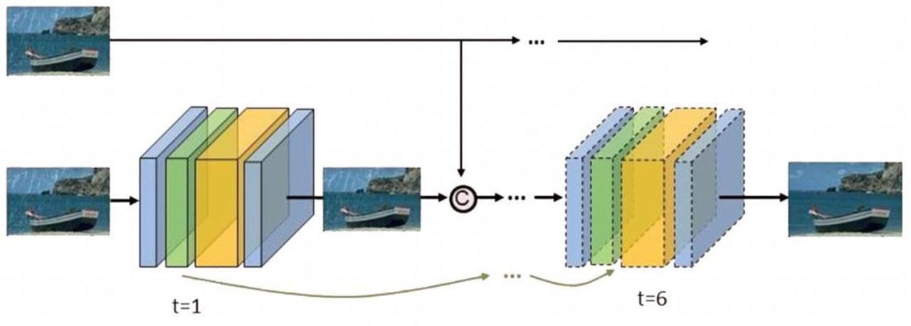 The generator network proposed in this paper is shown in Figure 4 and is mainly divided into four parts: (1) a convolutional layer receives the input image; (2) the combination of several residual blocks ResBlocks is used to extract deep feature information; (3)The recurrent unit adopts the long short-term memory unit LSTM, and this stage takes the output of the input and the state of the recurrent layer of the previous stage as the input; (4) A convolutional layer outputs the rain-removed result image. Represented by the following formula: