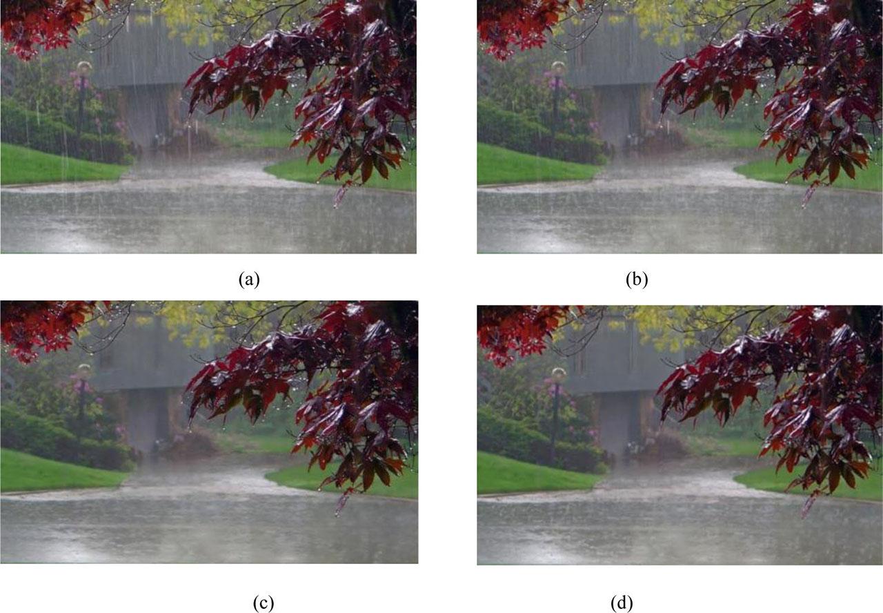 The network model of the algorithm in this paper is trained on the synthetic rainy day data set[5]. Therefore, in the comparison of the real rainy day result images of the following methods, we will judge from various aspects according to human subjective vision, and continue to use two of the deep learning algorithms (JORDER and RESCAN) used in the comparison of synthetic datasets. Compared with the synthetic data set, the real rainy day situation is more complex, which makes the image quality of the picture more diverse than the synthetic rainy day data set, and can better detect the generalization ability of the rain removal method.