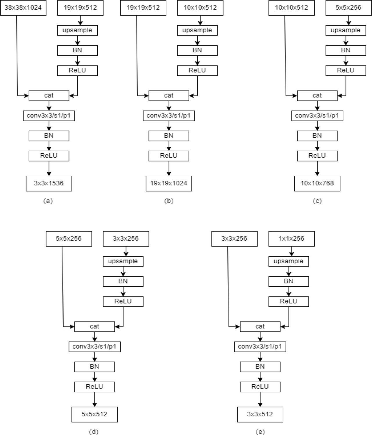 In Figure 3(e), the feature maps of the Conv10_2 layer are fused with the feature maps of the Conv11_2 layer, and the feature maps of the Conv10_2 layer are replaced with the obtained feature maps.