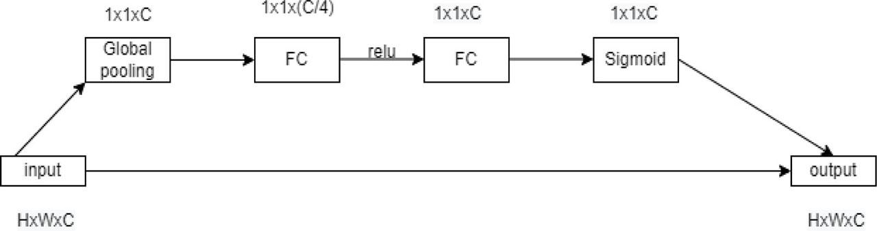 After completing two full connections, the weights (between 0 and 1) of each channel in the input feature map are obtained by performing another Sigmoid to fix the value between 0 and 1.