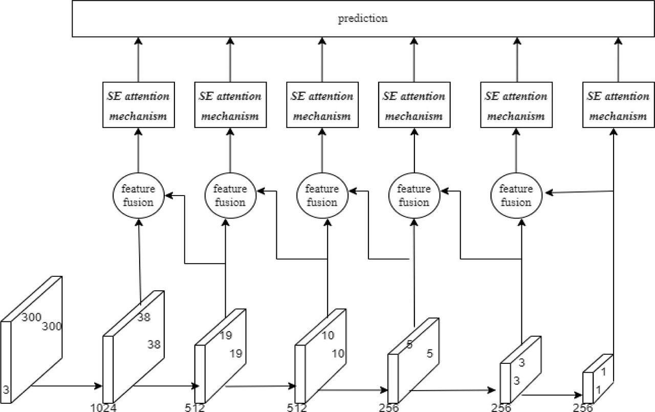 The feature map contains a large number of channels, and the judgment of the network varies from channel to channel. Some channels contain rich information and some channels hardly play a role. The purpose of introducing the SE attention mechanism is to make full use of the feature channels that contain important information. The SE attention mechanism is added to the back of the six predicted feature maps obtained after feature fusion, so that it adaptively assigns weights to each channel in the feature maps, strengthening the useful feature channels while suppressing the useless ones. The SSD model with the added SE attention mechanism is shown in Figure 5.