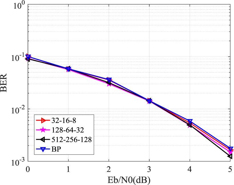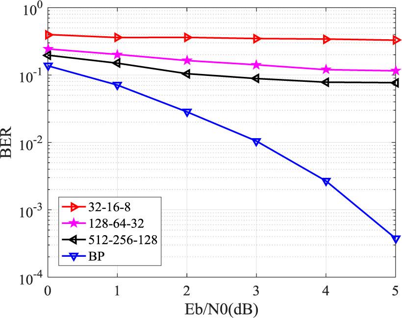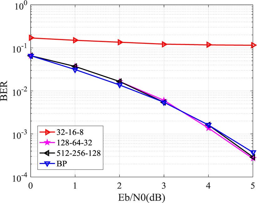 The simulation results show that when the code length is very short, the decoding performance of the three network structures is similar, and their performance is better than the traditional BP decoding algorithm. For the case of N=16, the network structure of 32-16-8 cannot be decoded correctly. However, for the case of N=32, none of the three network structures can achieve the decoding function, requiring a more complex network structure to complete this task. However, the number of parameters for the 512-256-128 network structure is already very large. Therefore, it can be seen that the exponential growth of the complexity of the network structure with the length of information bits will seriously restrict the development of neural network decoder technology.