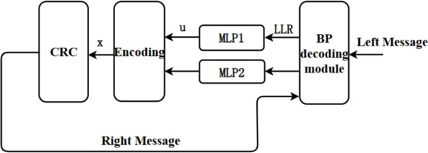 The decoding is divided into two parts. The neural network block part contains multiple parallel MLP decoding blocks, each decoding block corresponding to polar codes sub block, arranged in parallel at the leftmost end of BP decoding. Replacing a part of BP decoding with neural network blocks combines the advantages of BP decoding algorithm and MLP decoding algorithm, maintaining parallel decoding. For the proposed algorithm, the size of NND portion is not fixed, but is determined by the training ability and performance requirements of the network. The larger the NND portion, the less the number of blocks, and the closer the entire system structure is to traditional neural network decoders, resulting in a significant increase in the difficulty of neural network training; On the contrary, the larger BP part, the closer its decoding performance will be to the performance of BP algorithm.