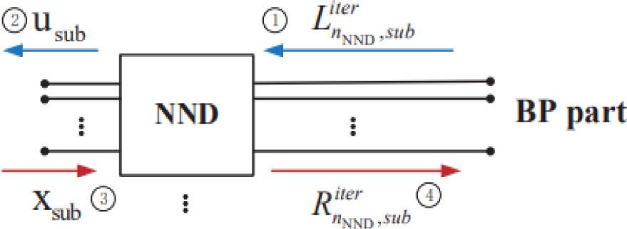 The whole module input is yN, output is uN, set the maximum number of iterations to itermax, first initialize the rightmost L information to equation (3), then according to equation (4) will pass the information to the left, when it reaches the neural network module, using the pre-trained NND sub-block to calculate the corresponding usub, It should be noted that although current neural network decoders generally use directly acquired channel values as the actual data source for training data and decoding, the literature [4] points out that using the log-likelihood ratio LLR as the input to the network can also achieve good decoding results.