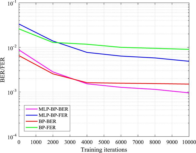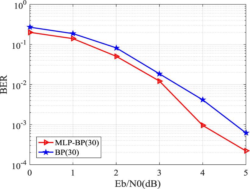 The literature [7] and [16] used neural networks to improve BP decoding algorithm and achieved good performance. However, the complexity of the neural network and the corresponding training difficulty are positively correlated with the difficulty of decoding, and the size of the codebook set is exponentially related to the length of the information bits. When the length of information bits is long, it is difficult to train a suitable neural network. Below, some comparative simulations will be conducted to demonstrate this problem.