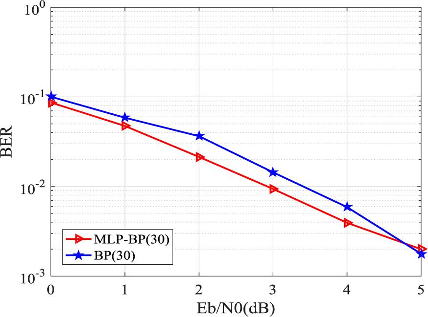 Experiments are first conducted using code word N=32, and the code word is divided into 4 blocks, each of which had 8 bits. The trained model is saved, and after the training of the sub blocks is completed, it is cascaded to the end of BP decoding to replace the last three layers of BP. The performance comparison with BP decoding both using 30 iterations is shown in Figure 11.