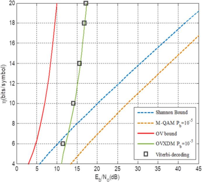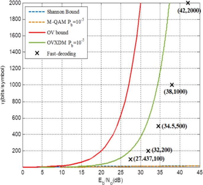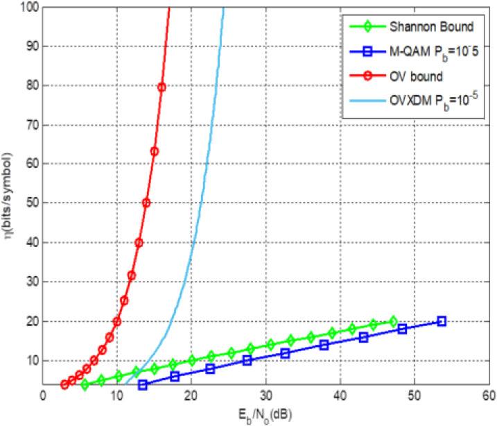 Comparative results of simulation of Shannon bound, Ov bound, QAM, and OVXDM fast algorithms (η≤2000bps/Hz Nyquist bandwidth)