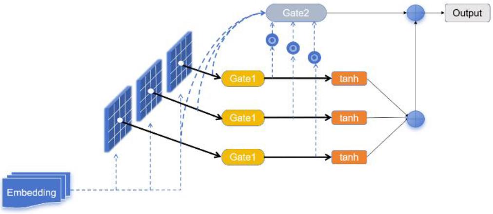 The three Gate1 branches are fed into the three parallel Gate1 branches through Embedding vectors processed on the embedding layer. Each Gate1 branch calculates the similarity score α_(t,i) according to formulas (1) and (2), which is used to control the filtering of information: