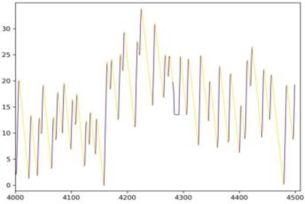 The experimental data set contains pupil position sequence data collected during simulated flight missions, captured by high-precision eye tracking equipment, and pre-processed steps (such as filtering, normalization, interpolation processing) to ensure the quality of the data. The dataset size covers thousands of samples, each containing a continuous sequence of pupil positions over a period of time and their corresponding ophthalmogram labels. Before data preprocessing can begin, we need to data label the raw eye movement data. As shown in Figure 5, the slow-phase nystagmus region is marked yellow. The marking process is as follows : ① Draw a line chart with the above eye movement data. ② Select the area where the difference between the maximum and minimum values of the ordinate is greater than 1 and the slope is slow as slow-phase nystagmus, and mark all frames in this area as 1. Repeat the above process until all the points contained in the slow-phase nystagmus region have been correctly labeled, and the remaining points are labeled as 0.