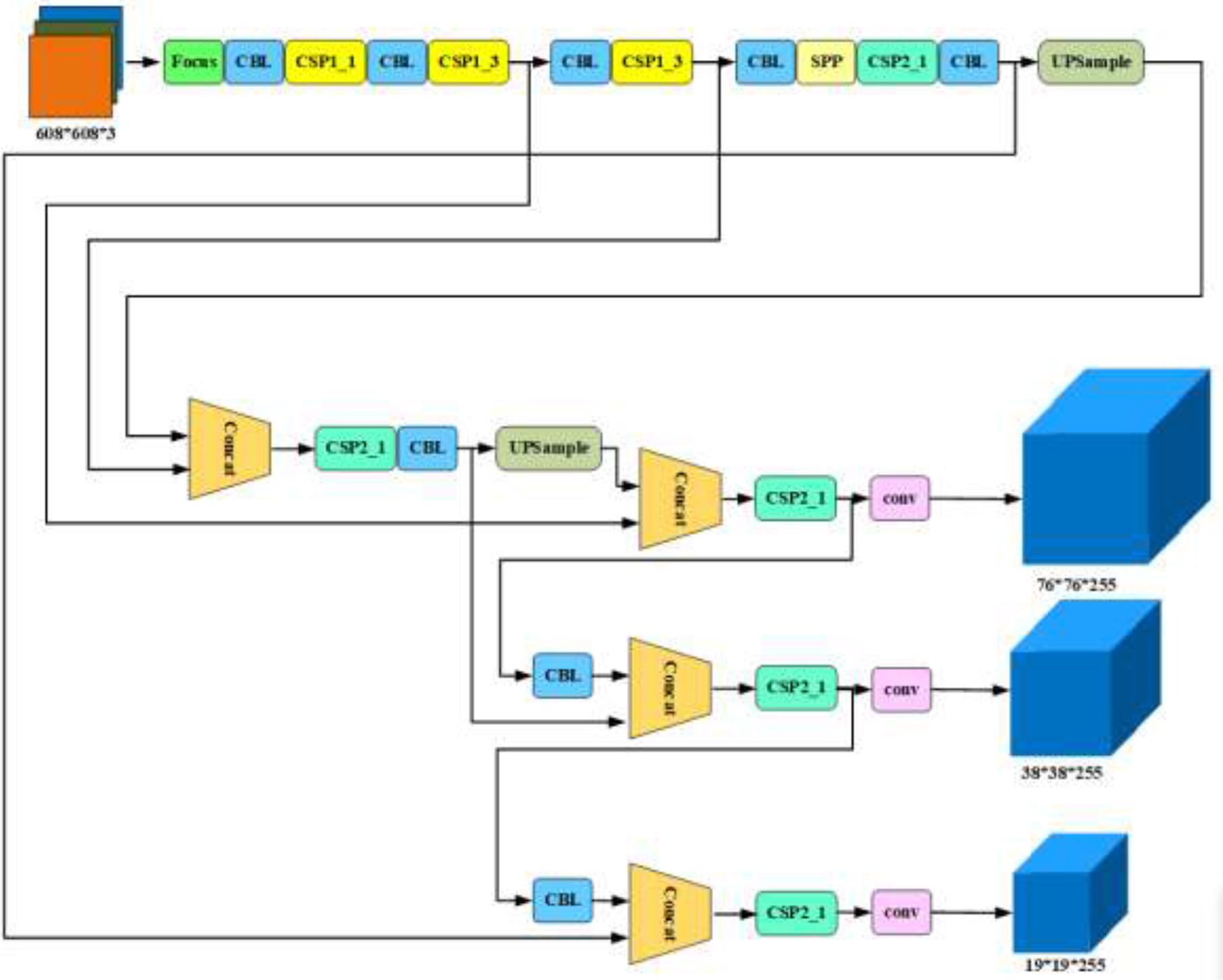 The Backbone network uses the CSPNet structure, employing cross-stage partial connections to reduce the number of parameters and improve computational efficiency. This connection method captures and transmits feature information more effectively, enhancing the model's performance. The introduced SPP module allows for pooling and feature extraction at different scales, further improving detection performance. Additionally, the Focus structure is implemented, which slices the input feature map into two parts. This helps reduce computational load and improves the model's computational efficiency while more effectively capturing the target's feature information. Residual connections are also employed to alleviate the vanishing gradient problem, making the model easier to train.