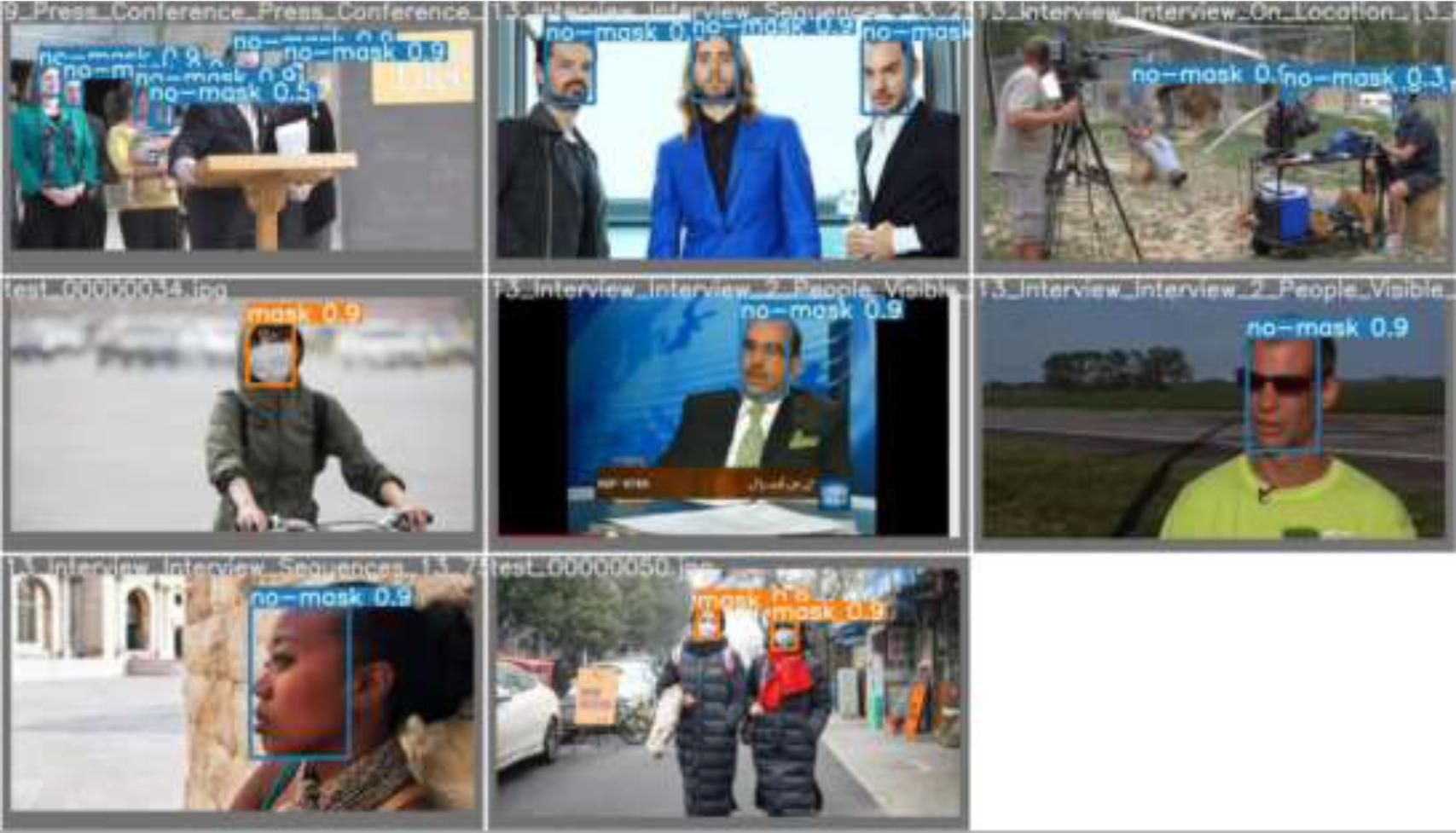 During the training process, the experiment utilized the YOLOv5 algorithm, which is widely recognized for its efficiency and accuracy in object detection tasks. The training environment was set up on Windows 10, using PyCharm Community Edition 2020.2.1, Python 3.8, and the LabelImg tool for data annotation. After annotation, the dataset was divided into training and validation sets in an 80:20 ratio. During the annotation process, care was taken to include a rich variety of mask and non-mask samples, accurately labeling the position and category of each sample while considering variations in shape, size, color, lighting, and angle. Ensuring the accuracy and consistency of the annotations was crucial to minimize noise during model training. Experiment employed tools such as LabelImg, VGG Image Annotator, and commercial platforms like Amazon SageMaker for the annotation process. Additionally, the data preprocessing steps included Mosaic [11] data augmentation, image scaling, cropping, centering, and converting from RGB to BGR, further introducing data diversity through random cropping, rotation, and flipping. This comprehensive approach laid a solid foundation for the mask recognition experiment, with Figure 3 showcasing the experimental results and clearly illustrating the model's performance in this task.