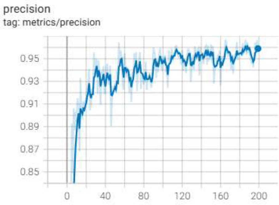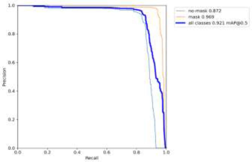 A high precision value indicates that the classifier can effectively identify positive samples while rarely misclassifying negative samples as positive. This is particularly important in the task of mask recognition, as high precision ensures that the model can reliably detect individuals wearing masks in real-world applications. In this experiment, the precision results for mask recognition are shown in Figure 4, further demonstrating the model's performance and effectiveness in this task. Additionally, by continuously optimizing the model architecture and training strategies, we aim to maintain high precision while enhancing other metrics for a more comprehensive performance evaluation.