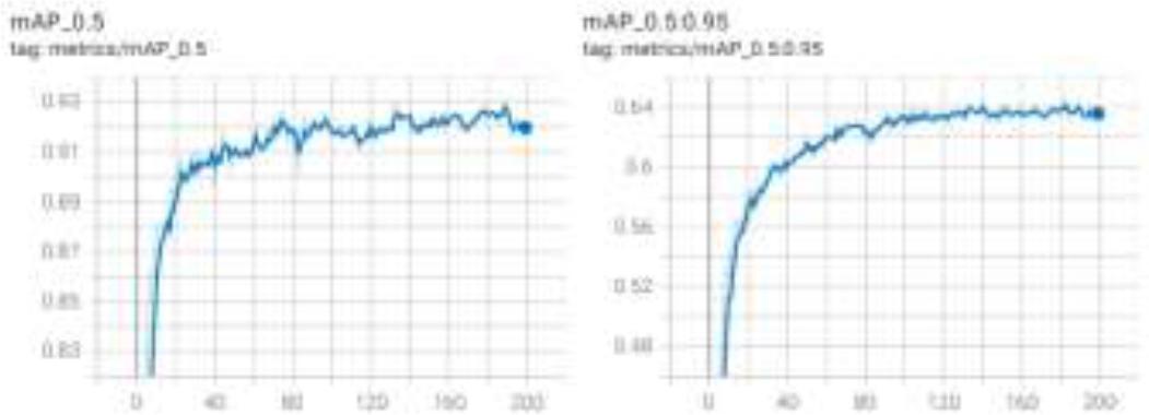 Additionally, mAP (mean Average Precision) is a commonly used evaluation metric in the field of object detection, which measures the overall performance of the model [12]. It is calculated by evaluating the detector's performance across multiple IoU (Intersection over Union) thresholds. mAP@0.5 refers to the mean average precision calculated at an IoU threshold of 0.5, whereas mAP@0.5:0.9 represents the mean average precision over a range of IoU thresholds, from 0.5 to 0.9. These two metrics explain the model's detection capabilities under different conditions, particularly when faced with complex backgrounds and diverse populations. The mAP performance metrics calculated in this experiment are shown in Figure 7.