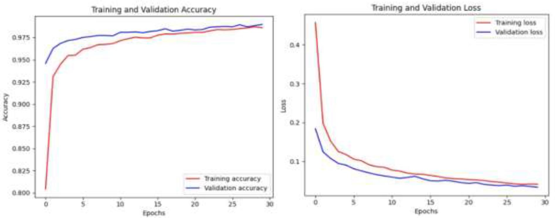 The model's stability and ongoing performance improvement were demonstrated by plotting the loss and accuracy curves for both training and validation. As shown in Figures 11 and 12, the accuracy and loss curves for the VGG16 and ResNet50 models exhibited distinct patterns after 30 epochs of training. During the early epochs, the models had lower accuracy and higher loss values. However, as training progressed, the accuracy gradually improved, and the loss decreased. By the end of 30 epochs, both the accuracy and loss curves had stabilized, indicating convergence. Ultimately, the accuracy of VGG16 and ResNet50 reached 98.49% and 97.51%, respectively[15].