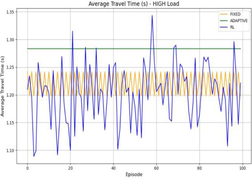 In the medium-load scenario, DB-DRL still outperforms the two traditional control methods, and despite some fluctuations, its passing time is generally shorter, showing the ability to respond quickly to the changes in road conditions, and realizing the optimal scheduling strategy under different flow conditions.