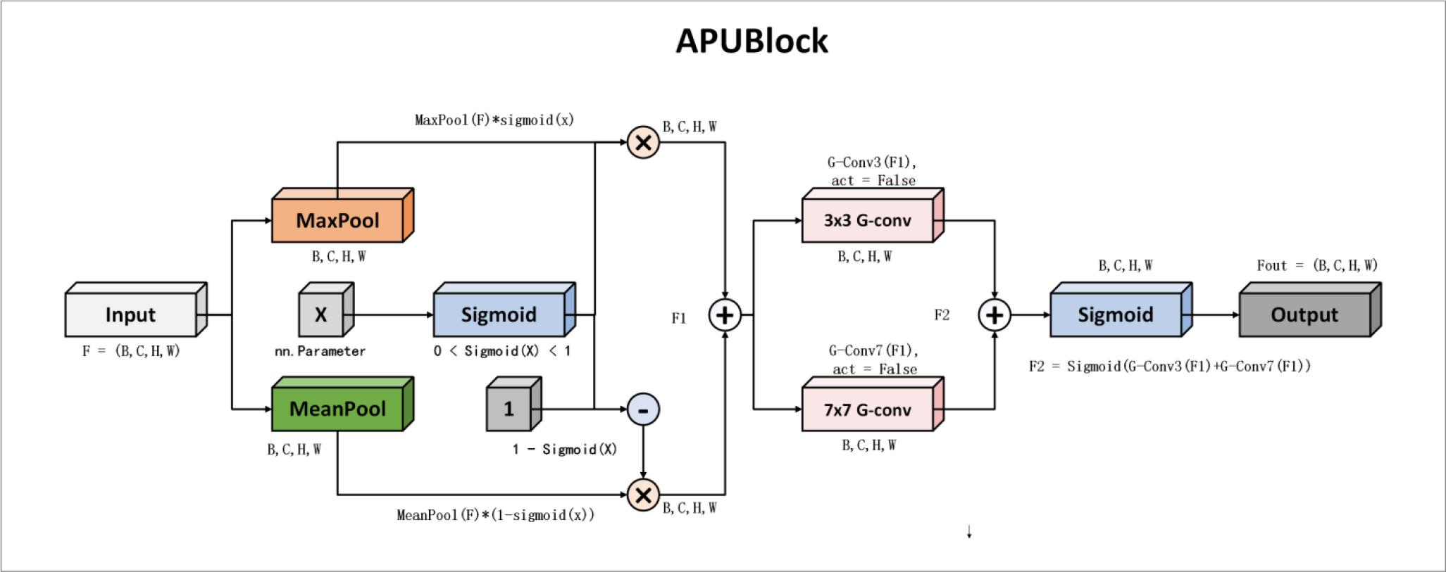 As shown in Figure 4, the Adaptive Pooling Unit (APU) serves as the core component of the APFB module. Each pooling fusion stage in APU follows an identical structure: the input features undergo both max pooling and average pooling to capture strong local activations and smoothed contextual features, respectively. Then, a learnable parameter controls the fusion ratio between the two, enabling adaptive expression of different scale features. The fused features are processed in parallel by two convolutional branches—one employing a 7×7 convolution for a large receptive field, and the other using a 3×3 convolution for fine-grained details. The outputs of both convolutions are element-wise added and passed through the SiLU activation function for nonlinear transformation, thereby enhancing the expressiveness of the resulting feature map.