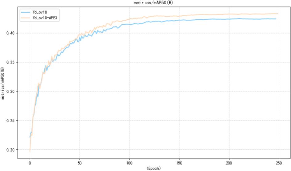 Experiment IV: Both AFPB and EFA modules were integrated simultaneously. The model parameters increased to 7.80 million, with computation maintained at 21.8 GFLOPs, and inference speed remained unchanged. This configuration achieved the highest model accuracy in the ablation study, with mAP rising to 43.5%, an improvement of 0.9 percentage points over the baseline. This indicates that the combined use of these two modules significantly enhances model performance while maintaining computational efficiency.