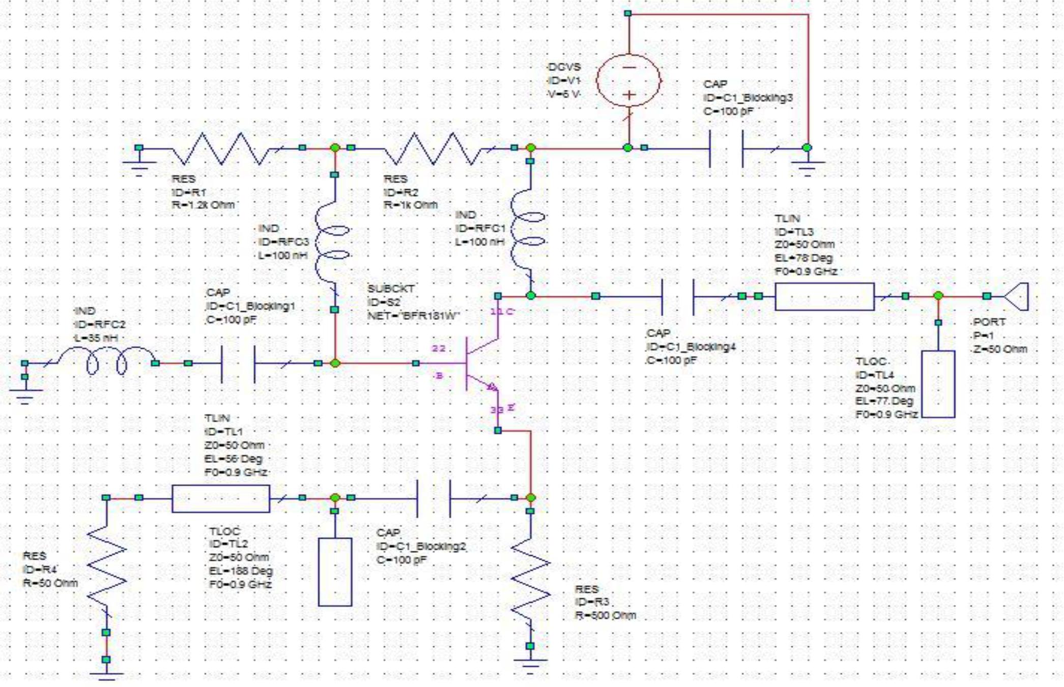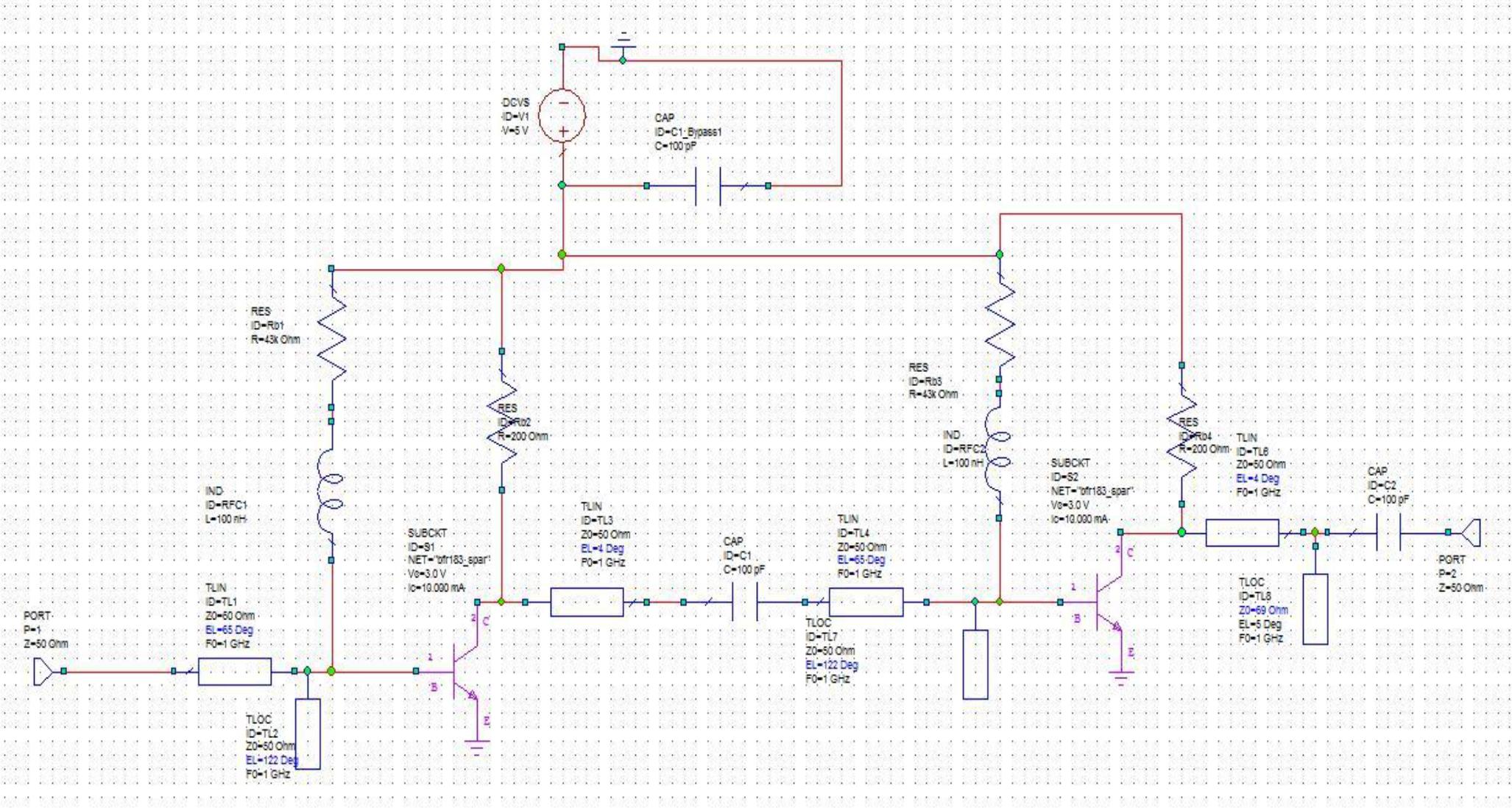 The Microwave Office Design Environment, developed by National Instruments, has been selected as the design software for this paper. This software is known for its user-friendly interface and encompasses all the essential features required for precise modeling and design of microwave components. Microwave Office includes tools for harmonic balance, time-domain analysis, electromagnetic simulation, and PCB layout design. Additionally, it offers capabilities for both linear and nonlinear noise analysis, enabling the modeling of nonlinear behaviors in microwave devices such as amplifiers under compression, mixers, and oscillators. The decision to use this software was also influenced by its provision of a complimentary six-month trial period for academic purposes. For the design of the low noise amplifier, the BFR 183 transistor was selected. The BFR 183 is an NPN silicon RF transistor manufactured by Infineon Inc., specifically designed for low noise and high-gain amplification. It features a transition frequency (FT) of 8 GHz. At the design frequency of 1 GHz, the transistor demonstrated stability, a low noise figure of approximately 1 dB, and a forward gain exceeding 10 dB. Under DC bias conditions of Vce = 3 V and Ic = 10 mA, the S-parameters of the transistor at the design frequency of 1 GHz are as follows: S11 = 0.2364<-179.899°; S21= 4.23399< 76.2°; S12=0.099599< 65.5°; S22 = 0.4165< -29.6°. The complete desin of the LNA is shown in Fig.4.