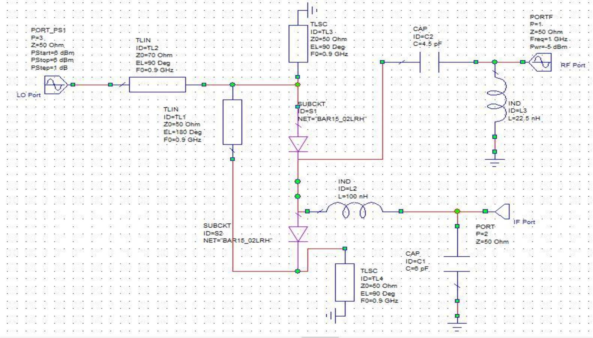 The mixer is constructed utilizing a single balanced configuration. This type of mixer comprises two single-ended mixers that are interconnected via a hybrid (either 90° or 180°). Such a design provides benefits including the cancellation of AM noise originating from the local oscillator (LO) source and the mitigation of spurious product reflections. Additionally, it ensures excellent RF/LO isolation. The mixer is engineered to achieve a conversion loss of less than 10 dBm, with LO to IF isolation exceeding 30 dBm and RF to IF isolation also surpassing 30 dBm. The complete schematic of the mixer circuit is illustrated in Fig.7.