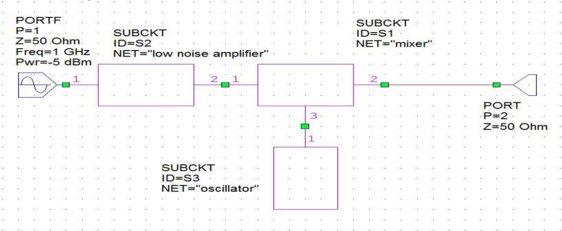 The three designs, namely the Low Noise Amplifier, the Oscillator, and the Frequency Mixer, have been integrated, and the parameters of the overall design have been simulated to yield a frequency downconverter, as illustrated in Fig.8.